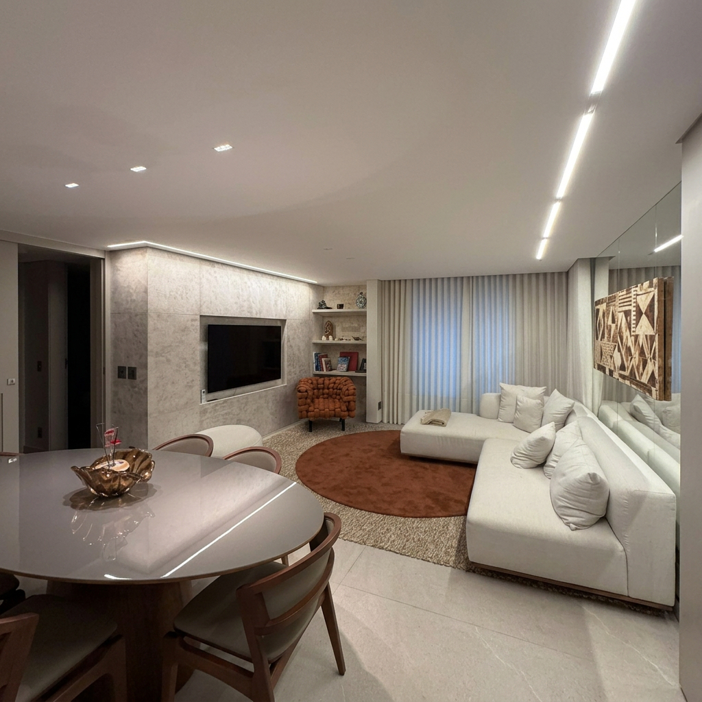 O living integra sala de estar e jantar em um único ambiente com iluminação em LED embutida no forro, piso em porcelanato de grande formato e cortinas motorizadas. O painel da TV em mármore e os acabamentos em tons neutros criam uma atmosfera contemporânea e acolhedora.